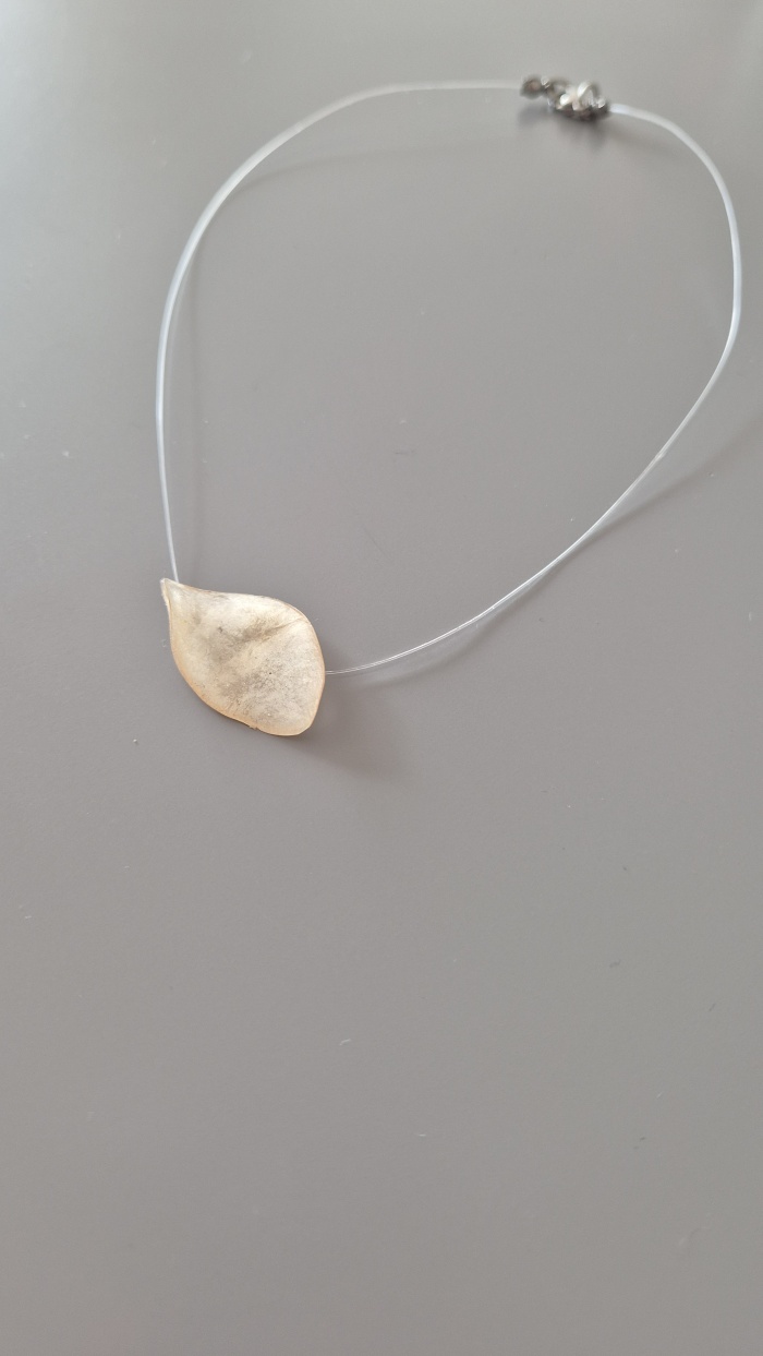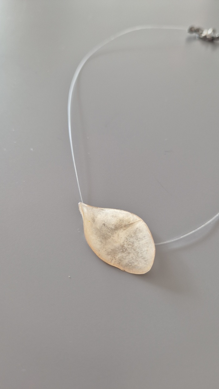 Ogrlica Lunarija izrađena je od prave biljke čije krhke i nježne listiće smo zaštitili epoxy smolom da traju zauvijek.